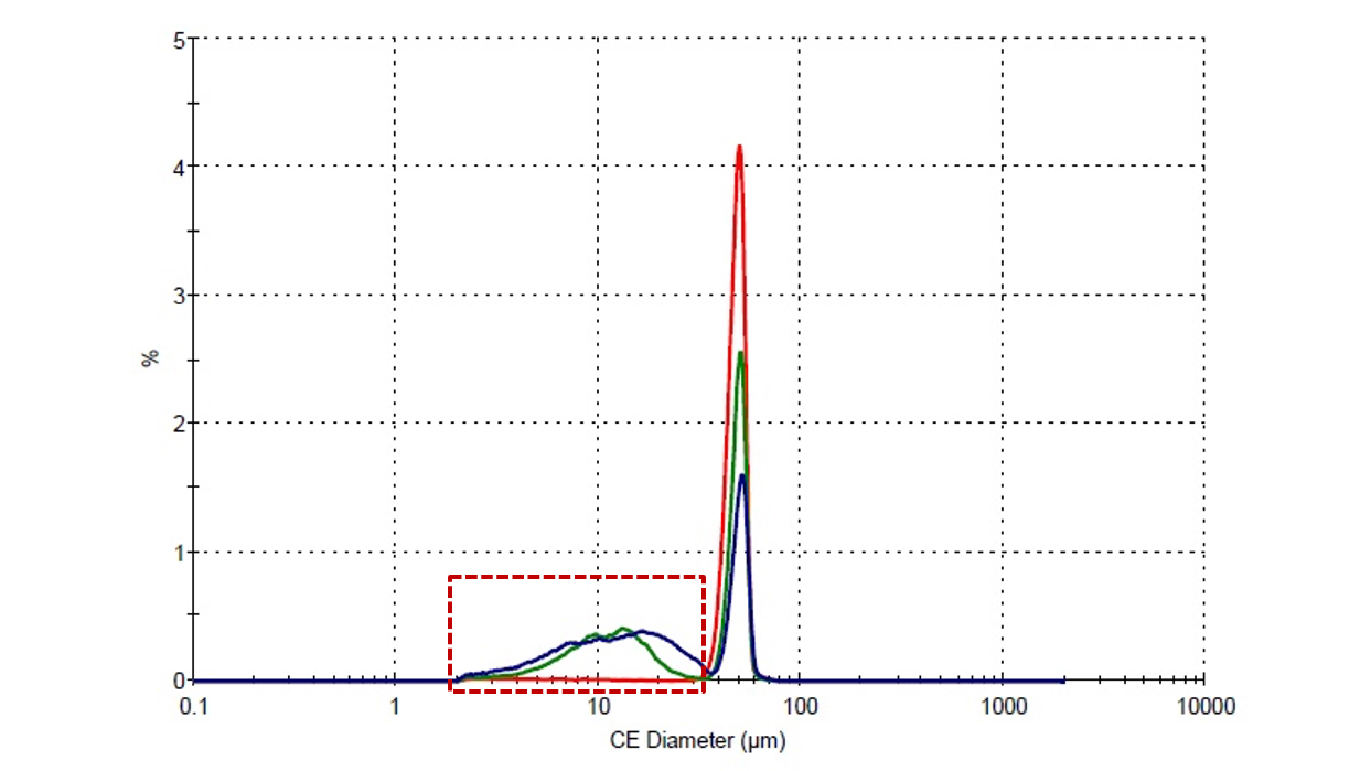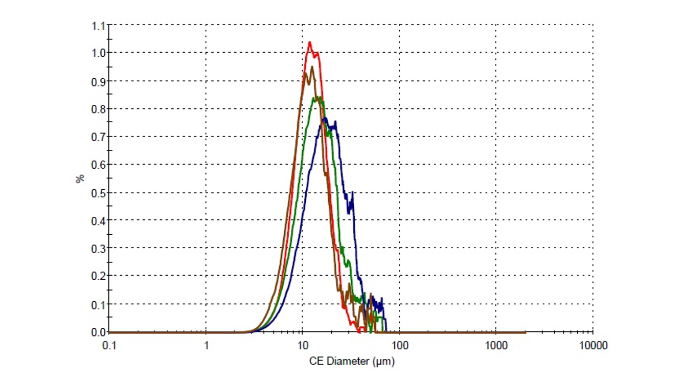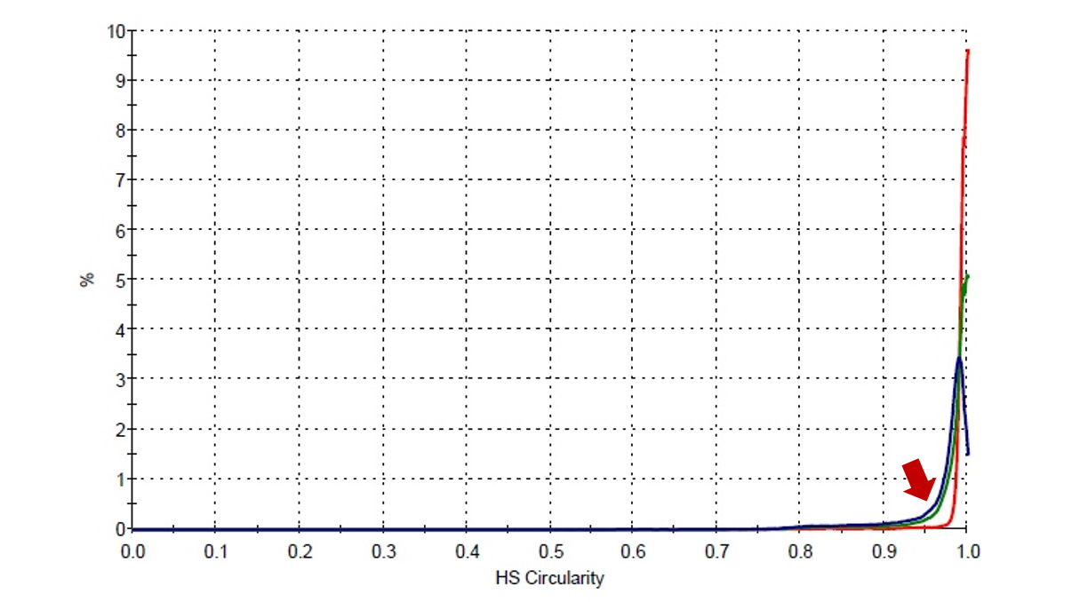 円形度(Dn50)は同等の結果となりました。Dn10については、ガラスビーズが0.98であるのに対し、12,000rpm条件は0.93、6,000rpm条件は0.89と差異がありました。6,000rpm条件の円形度は低くなりました。
