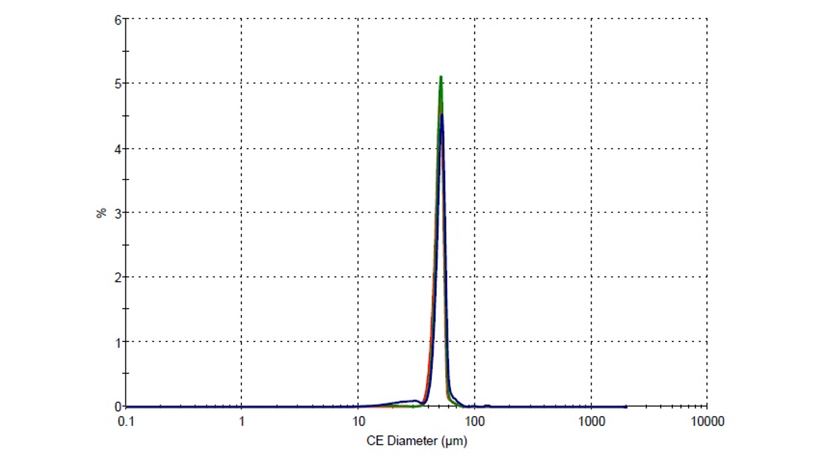 ※ガラスビーズの粒度分布はDv50:49.1 μm、アルミナ粉はDv50:0.5 μmです。