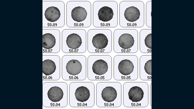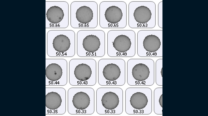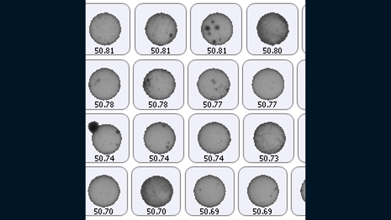 浸液透光法を用いてガラスビーズを透過させることによって、透過しないアルミナの被覆量と輝度値が相関するため、浸液透光法と画像解析法を組み合わせることで、被覆量を定量化しました。輝度値は粒子径に依存するため、粒子径を40〜60μmに限定した上で、輝度平均値を算出しました。その結果、条件毎に一定の差異を確認することができました。