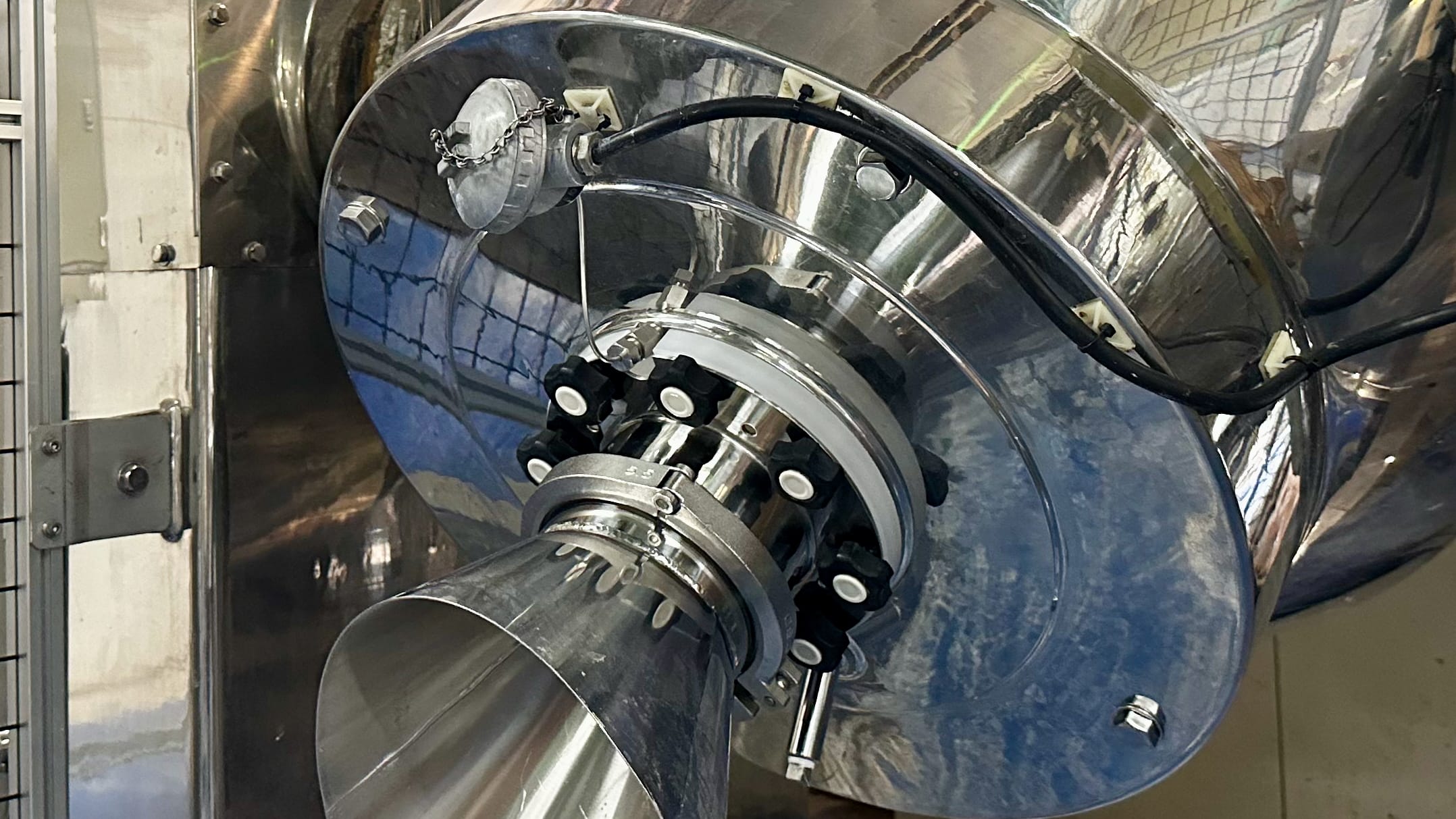 フリーズグラニュレーターで製造した凍結体は、回転式フリーズドライヤーによって凍結乾燥を行います。回転式フリーズドライヤーは、乾燥チャンバーが回転することにより、凍結体が短時間で均質に乾燥します。一般的な棚型凍結乾燥装置と比較した場合、乾燥時間を50%以上短縮することが可能です。シンプルな構造で、凍結体の仕込みや乾燥品の取り出し、洗浄を容易に行えます。スケールアップによる大型機の設計も可能です。また、フリーズグラニュレーターの製品回収部に複数台配置して連結することにより、連続式に近づけた製造を行うことが可能です(準連続式プロセス)。