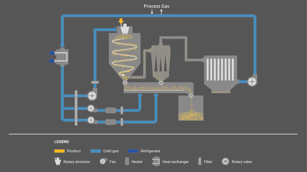 Spray congealing using a spray cooler can granulate thermoplastic resins and turn them into beads or prills. In the case of thermoplastic resins, the heated molten liquid is atomized into a cooling chamber and continuously contacted with a cooling gas stream that is lower than the melting point ( Tm ), producing cooled and solidified granules. The solidified granules are spherical and have excellent fluidity, resulting in a sharp and stable particle size distribution (PSD). Unlike spray drying, the liquid raw material contains almost zero moisture, resulting in larger particle sizes. In general, spray congealing produce granules ranging in size from several tens of μm to several mm.