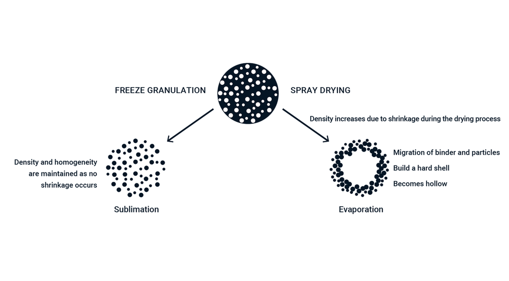 The dried granules obtained by freeze granulation are spherical in shape, have excellent fluidity, and can maintain low density and high homogeneity. The particle size range of the granules is relatively wide, ranging from 10 to 500 µm, and the tap density equivalent to or higher than spray dried powder can be obtained. Additionally, unlike high-temperature hot gas drying processes, there is no heat effect on materials, and oxidation can be minimized.