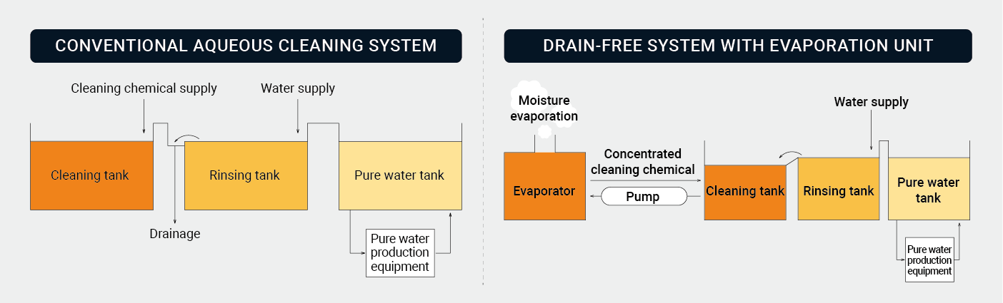 Effluent Evaporation Unit can be built-in to precision cleaning systems. The amount of effluent can be greatly reduced through concentration and evaporation. When installed in an aqueous cleaning system, cleaning chamicals consumption can be recycled. Rinsing performance can be improved by supplying water to the rinsing tank.